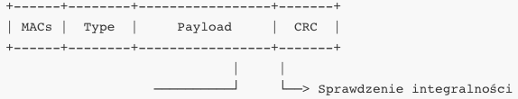 Preambuła to ciąg bitów (101010...), który synchronizuje odbiornik. Adresy MAC to unikalne identyfikatory interfejsów sieciowych zapisane w postaci 48-bitowej (np. 00:1A:2B:3C:4D:5E). Pole typ określa protokół warstwy wyższej (np. 0x0800 dla IPv4, 0x86DD dla IPv6), a CRC (Cyclic Redundancy Check) służy do wykrywania błędów transmisji.