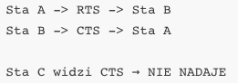 Dodatkowym mechanizmem jest RTS/CTS (Request to Send / Clear to Send). Przed wysłaniem właściwej ramki dane urządzenie wysyła krótką ramkę RTS, zawierającą informację o długości planowanej transmisji. Odbiorca odpowiada CTS, po czym rozpoczyna się transmisja danych. Wszystkie inne stacje, które odbiorą CTS, wstrzymują swoje nadawanie przez określony czas. Dzięki temu możliwe jest unikanie kolizji wynikających z tzw. problemu ukrytej stacji.