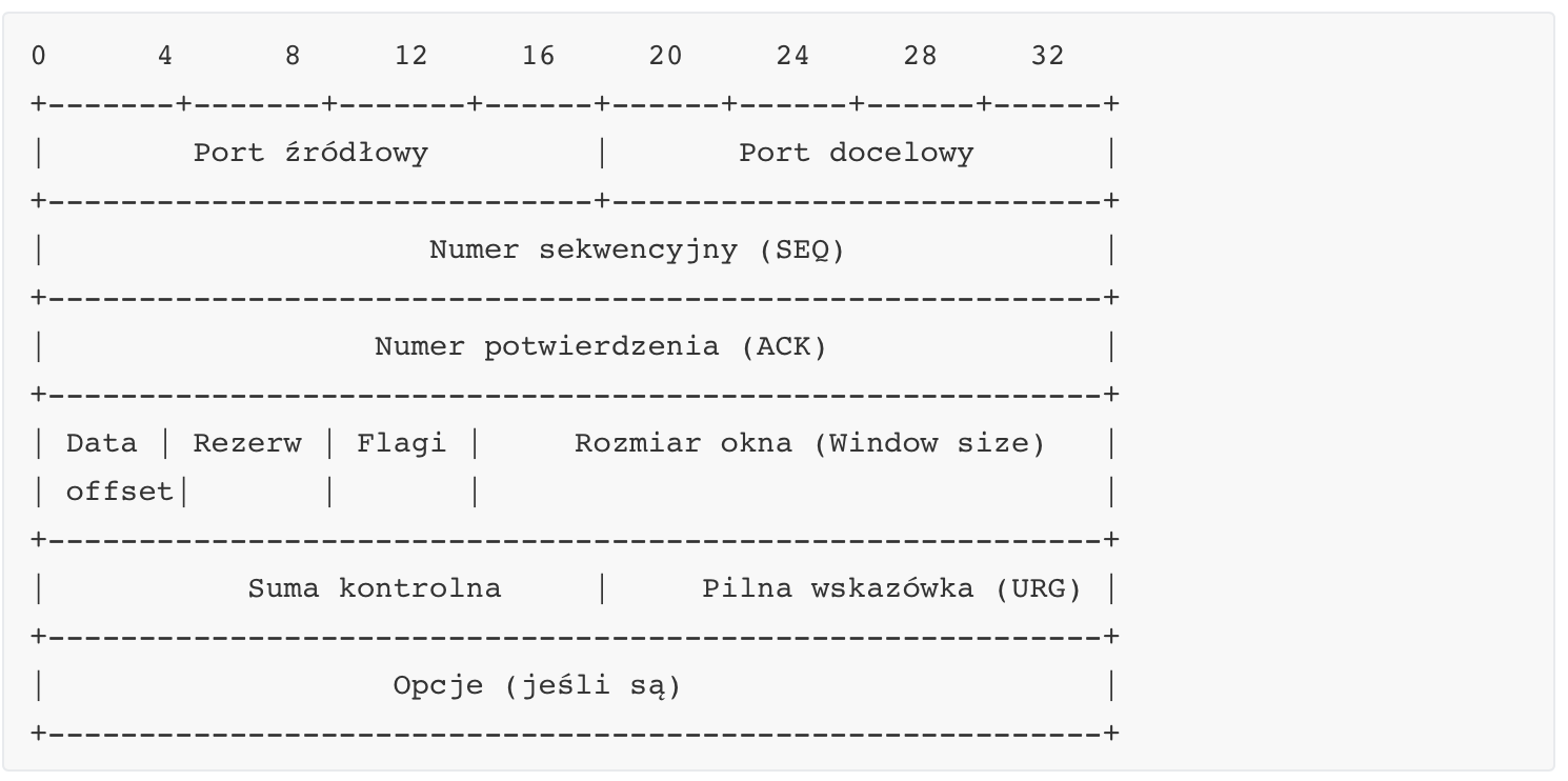 Nagłówek TCP ma zmienną długość (zazwyczaj 20 bajtów bez opcji), a jego pola zawierają kluczowe informacje sterujące przesyłaniem danych. Poniżej szczegółowe omówienie pól nagłówka:
