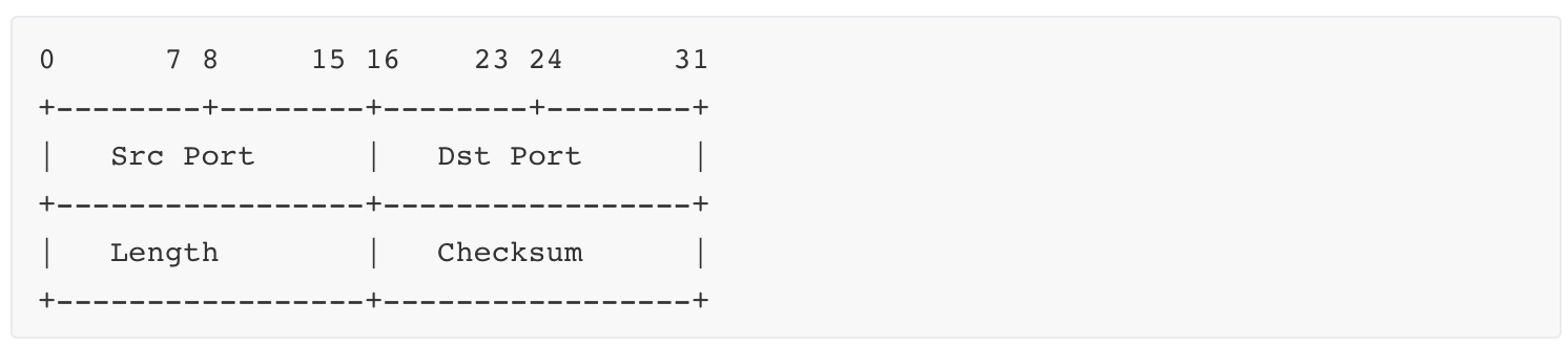 Nagłówek UDP ma stałą długość 8 bajtów, co czyni go niezwykle prostym w porównaniu do TCP. Składa się z czterech pól, z których każde ma długość 16 bitów (2 bajty):