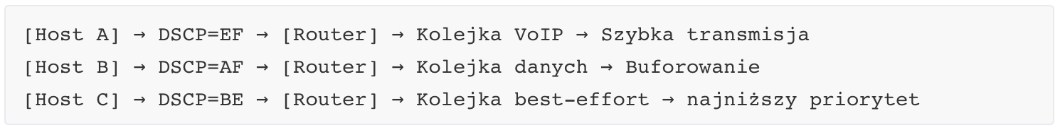 DiffServ jest bardziej praktycznym rozwiązaniem i opiera się na przypisywaniu pakietom etykiet w polu DSCP (Differentiated Services Code Point) nagłówka IP. Pakiety są oznaczane zgodnie z wcześniej zdefiniowanymi klasami usług (np. EF – Expedited Forwarding dla VoIP, AF – Assured Forwarding dla ważnych danych) i obsługiwane przez routery zgodnie z tymi oznaczeniami. DiffServ nie gwarantuje twardej rezerwacji zasobów, ale umożliwia różnicowanie poziomu usług i bardzo dobrą skalowalność.