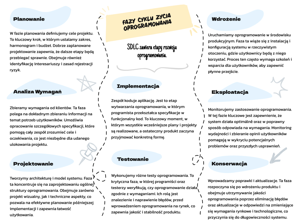 Etap 7: Konserwacja i Eksploatacja - po wdrożeniu, oprogramowanie jest utrzymywane i aktualizowane, aby zapewnić jego ciągłą funkcjonalność i bezpieczeństwo. Testowanie w tym okresie obejmuje regresję i testy wydajnościowe, mające na celu upewnić się, że zmiany nie wprowadzają nowych błędów.