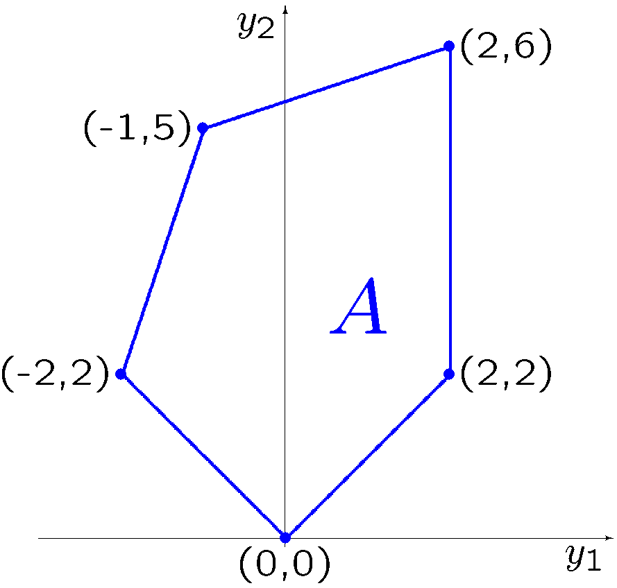 Ponieważ funkcje wyrażające oceny są liniowe, a zbiór dopuszczalny jest uwypukleniem swoich pięciu wierzchołków, to obraz zbioru dopuszczalnego w przestrzeni ocen jest uwypukleniem obrazu wierzchołków. Tym samym, zbiór ocen osiągalnych \(A\) przyjmuje postać pięciokąta