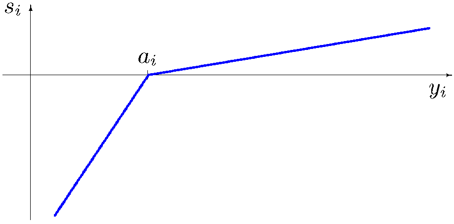 \(s_i (a_i,y_i) = \left\{ \begin{array}{rl} \beta \lambda_i ( y_i - a_i ),\quad \mbox{jeśli} \quad y_i \ge a_i \\ \lambda_i ( y_i - a_i ),\quad \mbox{jeśli} \quad y_i < a_i