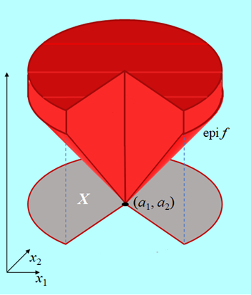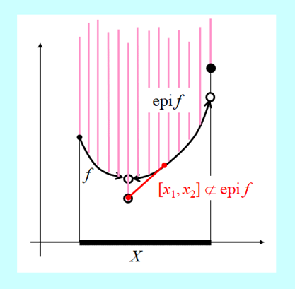 Zauważmy, że warunkiem koniecznym wypukłości zbioru \(\mathrm{epi } \) jest wypukłość zbioru X na którym jest określona funkcja f.