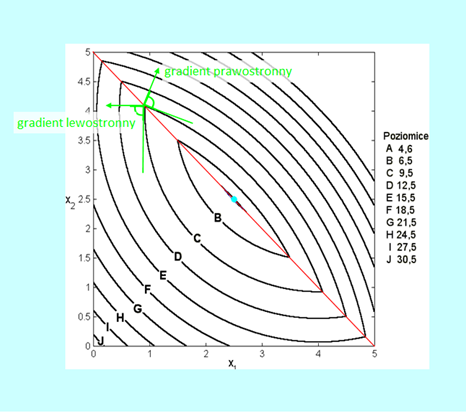 Z Rys. 3.1 wynika, że w otoczeniu x, (inaczej mówiąc lokalnie) najlepszym kierunkiem poprawy (kierunkiem, w którym lokalnie funkcja najszybciej maleje) jest prosta wyznaczona przez wektor minus gradientu policzonego w tym punkcie, zwanego antygradientem. Pytaniem, które tu się pojawia jest: jak daleko warto poruszać się w tym kierunku? Dyskusję nad tym, wbrew pozorom, niełatwym zagadnieniem przedstawimy później – w punkcie 4.1 modułu czwartego.