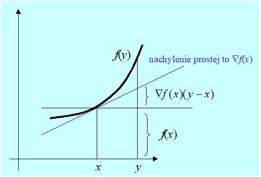Funkcja f jest wypukła na \(X. ⇔(∀x,y∈X)f(y)≥f(x)+∇f(x)(y-x).\)