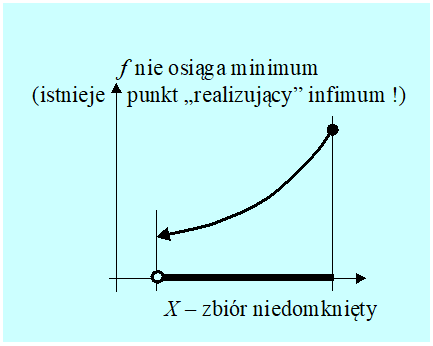 Dla funkcji jednej zmiennej archetypem funkcji wypukłej jest funkcja kwadratowa z dodatnim współczynnikiem. Funkcja ta oczywiście posiada minimum na dowolnym zbiorze domkniętym, także nieograniczonym. W związku z tym często sądzi się, że wypukłość gwarantuje istnienie minimum funkcji wypukłej na każdym zbiorze domkniętym. Tak jednak nie jest o czym świadczy przykład funkcji wykładniczej \(ℝ \ni x ↦ \mathrm{exp}(x) \in ℝ\), która jest ściśle wypukła i nie ma minimum w swojej, domkniętej przecież dziedzinie.