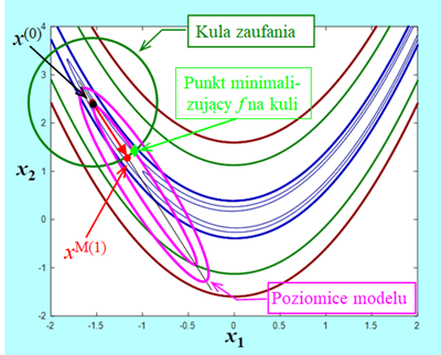 - Ponieważ punkt \(x^{M(k)}\) został wygenerowany w oparciu o model, to gdy kula jest za duża. może nie być właściwy – wartość rzeczywistej funkcji celu może być w nim większa niż w punkcie centralnym kuli. Oznacza to, że w stosowny sposób trzeba dostosowywać promień kuli do zmienności funkcji celu. Może to pociągnąć za sobą konieczność wielokrotnego rozwiązywania zadania minimalizującego funkcję modelującą na kuli zaczepionej w punkcie bieżącym.