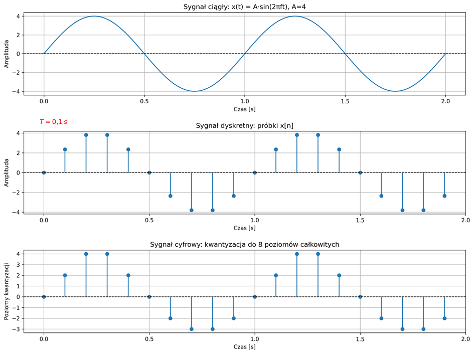 Rys. 2.1. Ciągły sygnał sinusoidalny oraz jego wersja dyskretna i cyfrowa