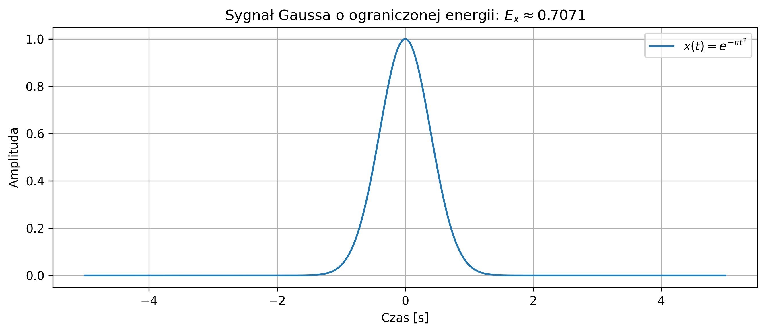 plt.title(fr'Sygnał Gaussa o ograniczonej energii: $E_x \approx {energy:.4f}$')