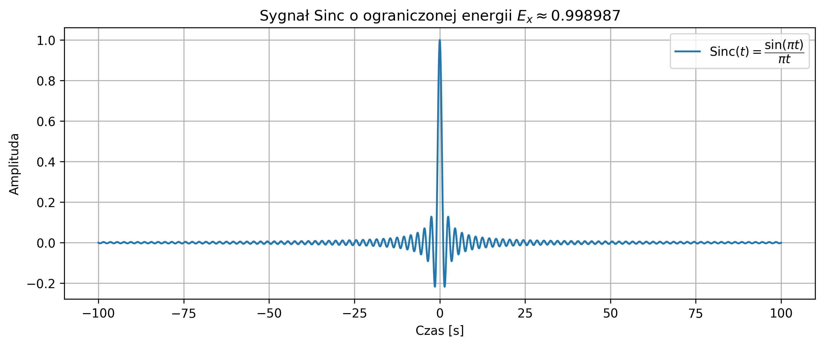 plt.title(fr'Sygnał Sinc o ograniczonej energii $E_x \approx {energy:.6f}$')