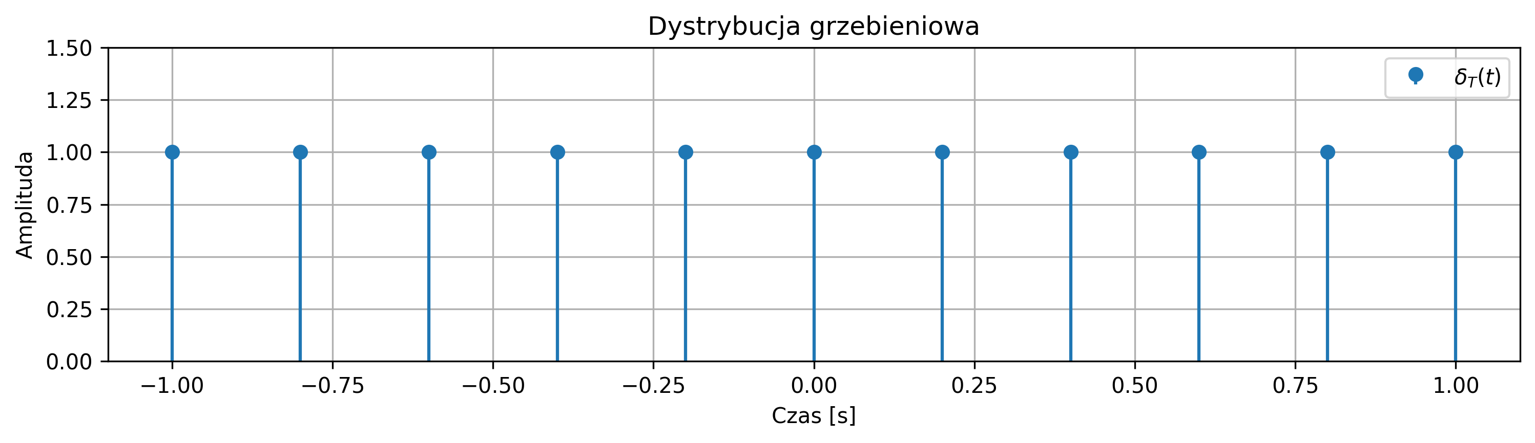 Dystrybucja grzebieniowa jest okresowym ciągiem impulsów Diraca, powtarzanych z okresem \( T \). Jej wykres przypomina nieskończony grzebień, którego „zęby” są równoodległe i mają jednakową wysokość: