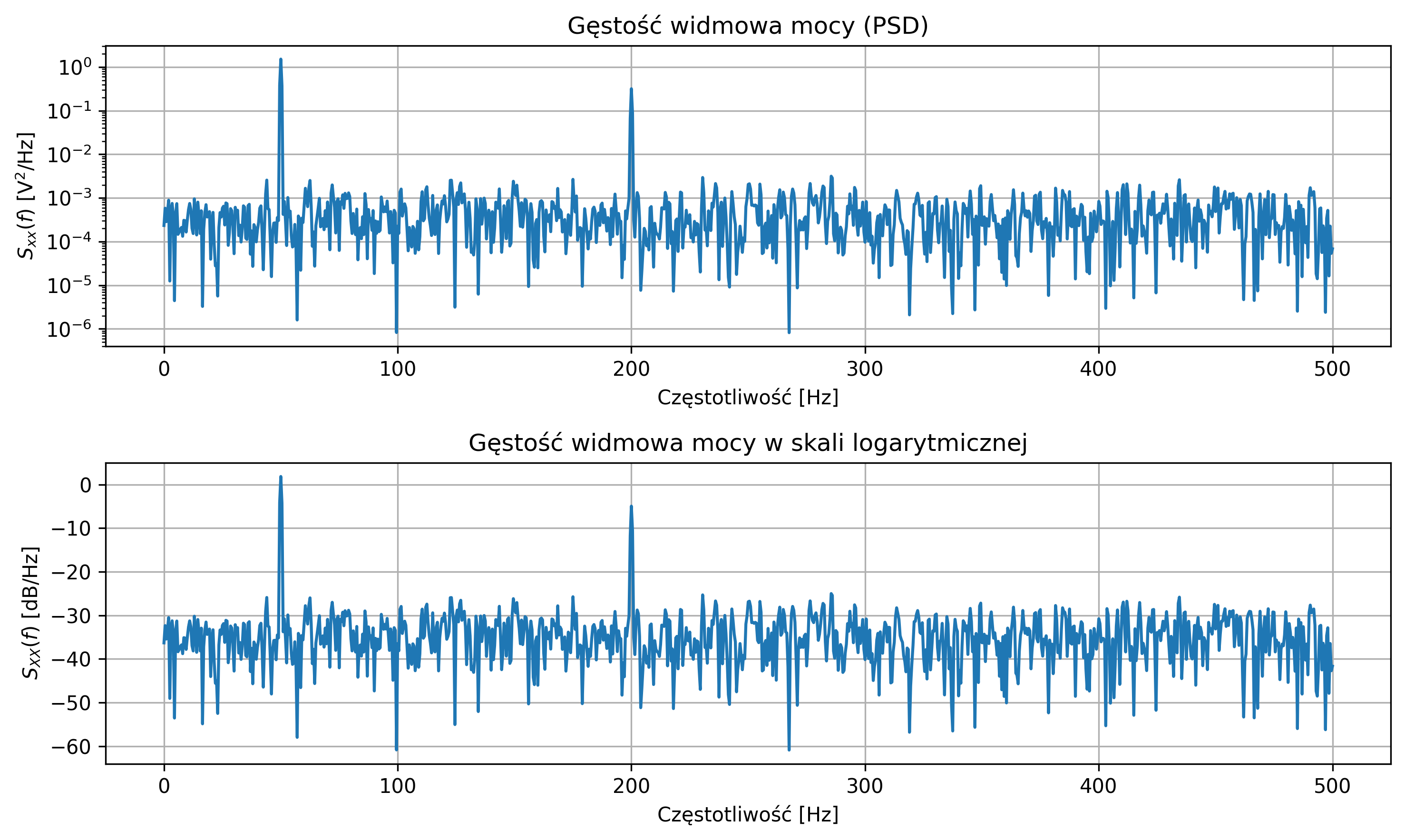 Na górnym wykresie PSD wyrażono w jednostkach liniowych \( \textrm{V}^2/\textrm{Hz} \). Widać wyraźnie dwa lokalne maksima (piki) odpowiadające częstotliwościom \(50\) Hz oraz \(200\) Hz, które odpowiadają składowym sinusoidalnym obecnym w sygnale. Szerokość i wysokość tych pików zależy od długości obserwacji i okna analizy – dłuższy sygnał daje lepszą rozdzielczość częstotliwościową.