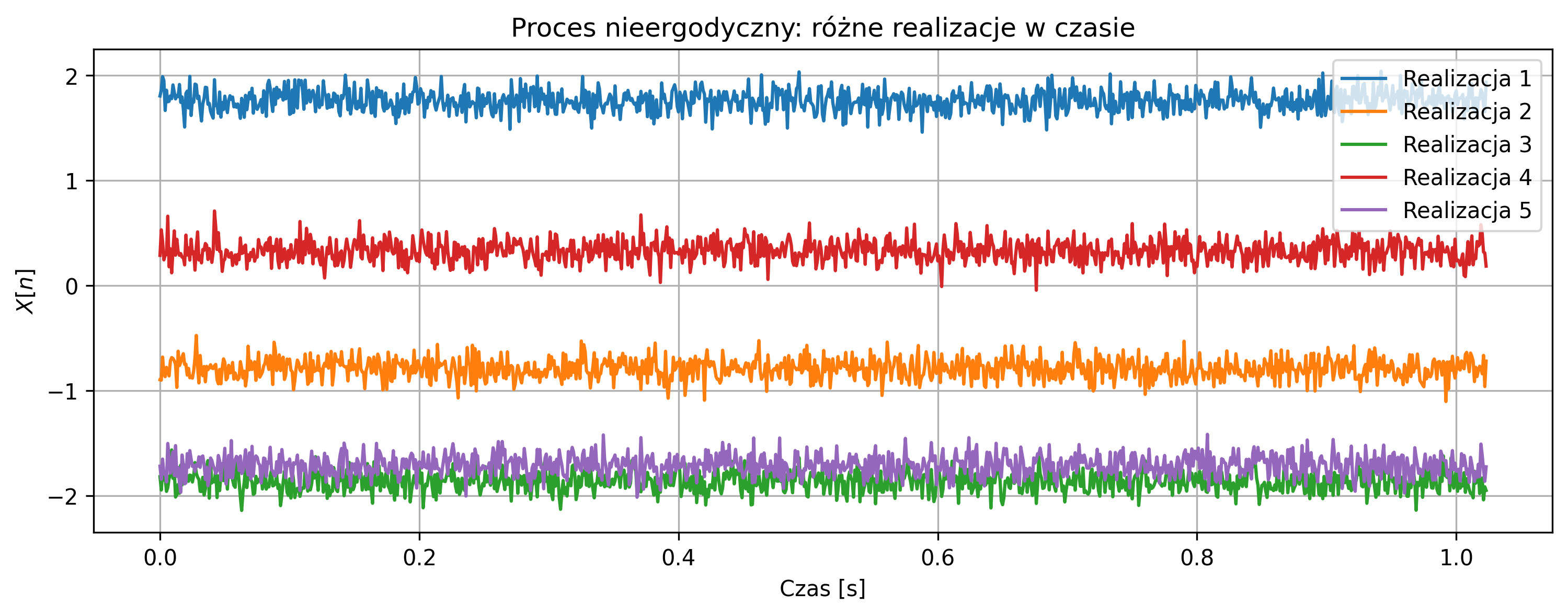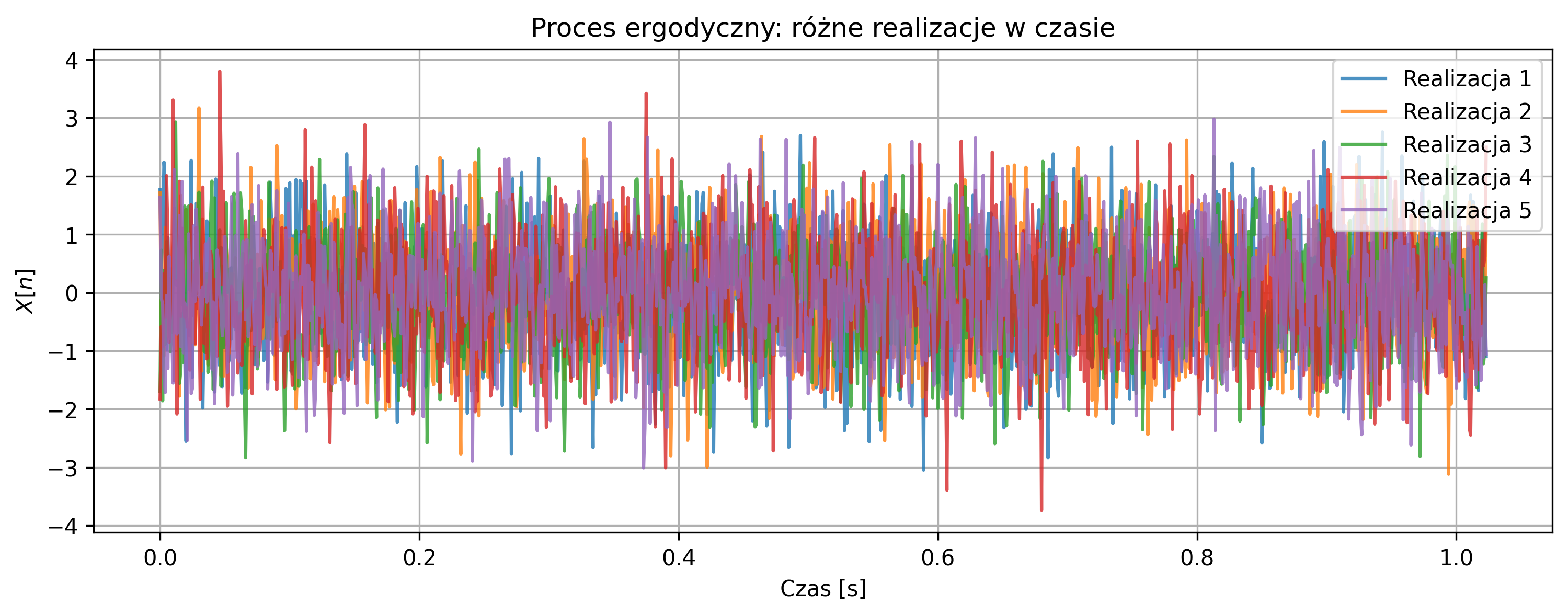 Na rysunku 5.15 przedstawiono pięć niezależnych realizacji procesu ergodycznego w czasie. Każda realizacja ma podobny przebieg – sygnał oscyluje wokół zera, a średnia wartość po czasie jest zbliżona do zera. Widoczne jest, że wszystkie realizacje mają podobny charakter losowy, co oznacza, że statystyki procesu (średnia, wariancja) są takie same niezależnie od wybranej realizacji. Oznacza to, że średnia po czasie jest równa średniej po realizacjach, a proces można uznać za ergodyczny.