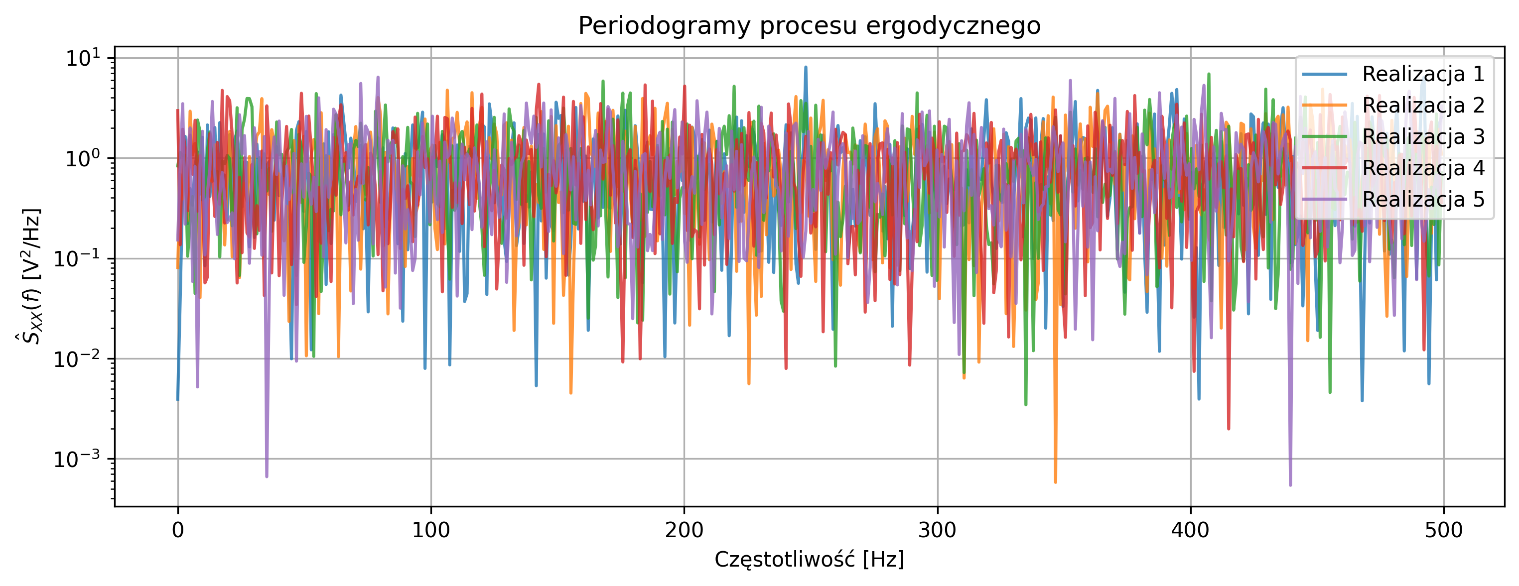 Wykresy periodogramów (oszacowania gęstości widmowej mocy), odpowiadających powyższym realizacjom w czasie, zilustrowano na rysunku 5.16. Widma poszczególnych przebiegów są do siebie podobne i nie zawierają dominującej składowej przy \( f=0 \). Moc jest rozłożona równomiernie w paśmie częstotliwości, co potwierdza stacjonarność i ergodyczność procesu.