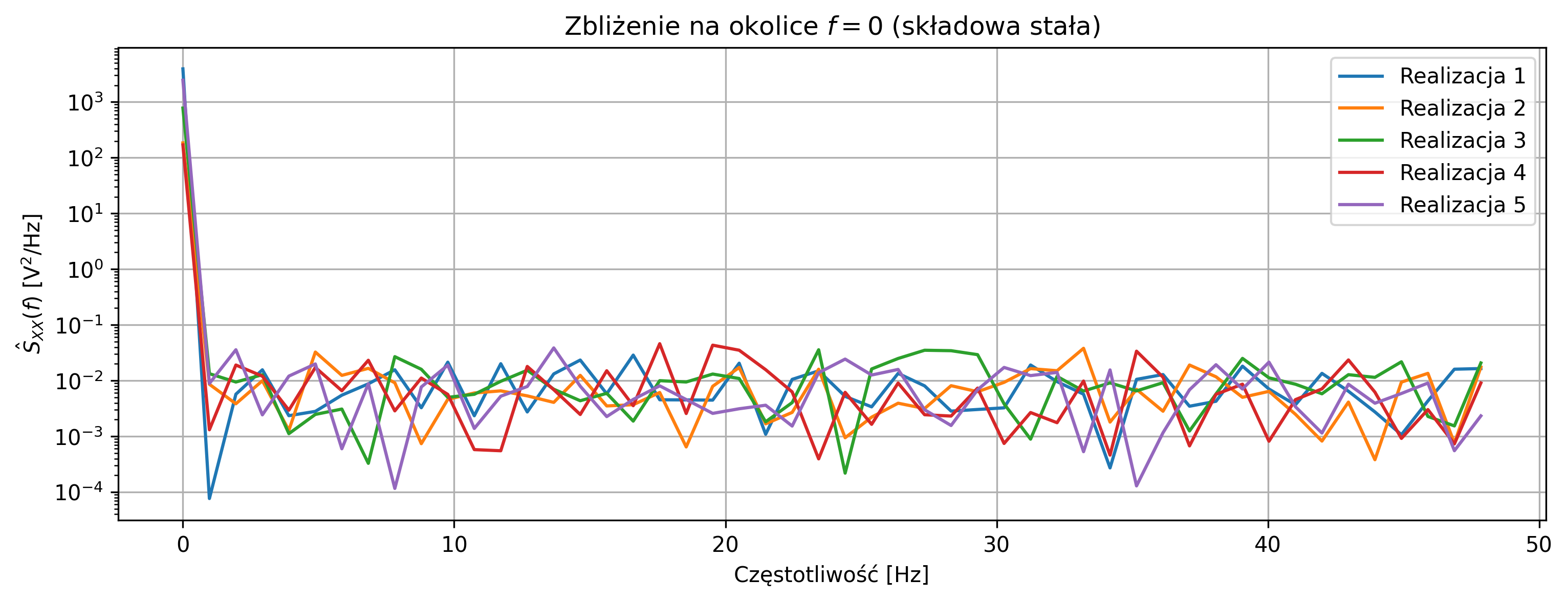 Ponieważ każda realizacja ma inną wartość składowej stałej \( A \), widmo w okolicach częstotliwości \( f=0 \) Hz (składowej stałej) znacząco różni się między realizacjami (rys. 5.18) – powoduje ona bardzo silną koncentrację energii przy częstotliwości \(0\), a wielkość tego piku różni się między realizacjami, bo różna jest wartość \( A^2 \). Widma w pozostałych częstotliwościach są podobne, ponieważ wynikają z białego szumu \( w[n] \). Krzywe periodogramów nie nachodzą na siebie tak regularnie jak w procesie ergodycznym, widmo nie jest stabilne statystycznie – nie da się przewidzieć jednej typowej postaci PSD.