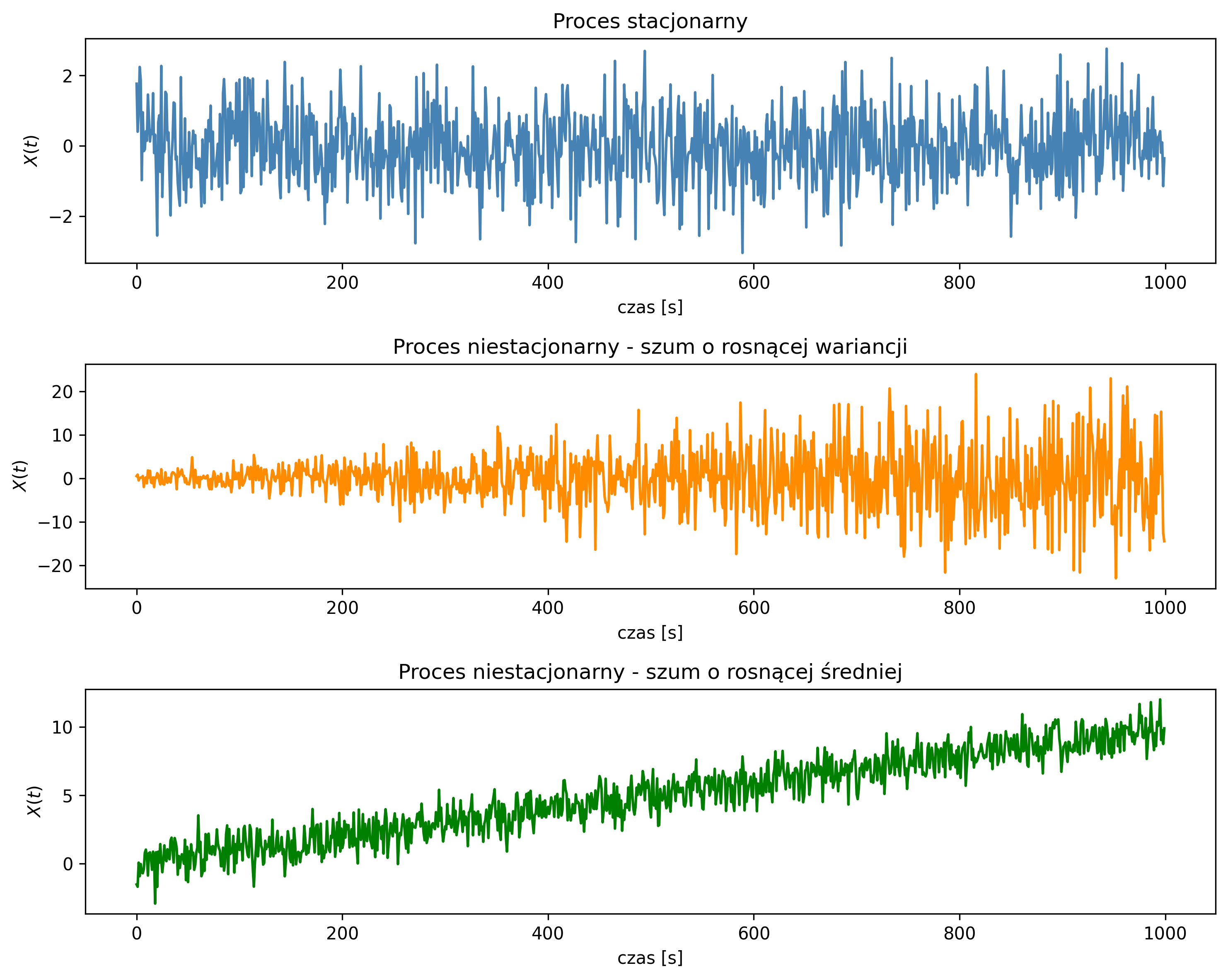 Na rys. 5.2 pokazano przykładowy przebieg procesu stacjonarnego i niestacjonarnego – ze względu na średnią i wariancję. Pierwszy wykres wskazuje na proces o stałej średniej i wariancji. Na drugim wykresie, proces niestacjonarny ma coraz większe odchylenia od zera, gdyż jego wariancja rośnie. Ostatni wykres ilustruje proces niestacjonarny ze względu na liniowo rosnącą średnią.