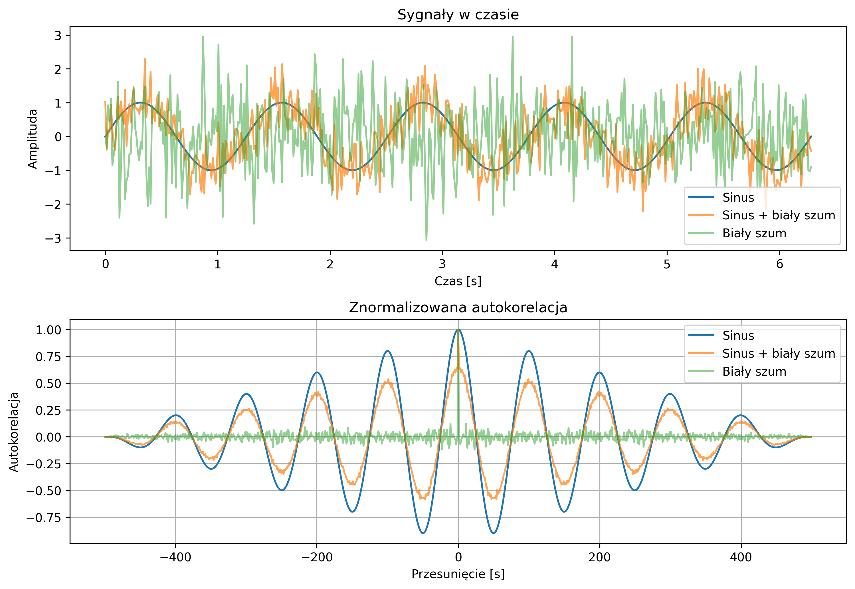 Sygnał sinusoidalny ma wyraźną periodyczną funkcję korelacji – na wykresie pojawiają się maksima i minima lokalne w regularnych odstępach. Oznacza to, że wartości sygnału w określonych przesunięciach są ze sobą silnie powiązane (dodatnio lub ujemnie). Innymi słowy, sygnał „pamięta” swoje przeszłe wartości i ma charakter okresowy. Biały szum ma funkcję korelacji bliską zeru dla wszystkich opóźnień poza zerowym. Wartości próbek są praktycznie niezależne od siebie, a proces nie ma pamięci. Korelacja pokazuje tylko pojedynczy impuls w \( \tau=0 \), czyli sygnał nie zawiera periodyczności. Sygnał sinusoidalny z dodanym białym szumem ma funkcję korelacji, w której nadal widoczne są periodyczne maksima i minima lokalne, jednak są one mniejsze i mniej regularne niż w przypadku czystego sinusa. Oznacza to, że sygnał wciąż zachowuje pewną pamięć swojej struktury okresowej, ale szum częściowo ją „maskuje”, wprowadzając przypadkowe zakłócenia i obniżając poziom korelacji.