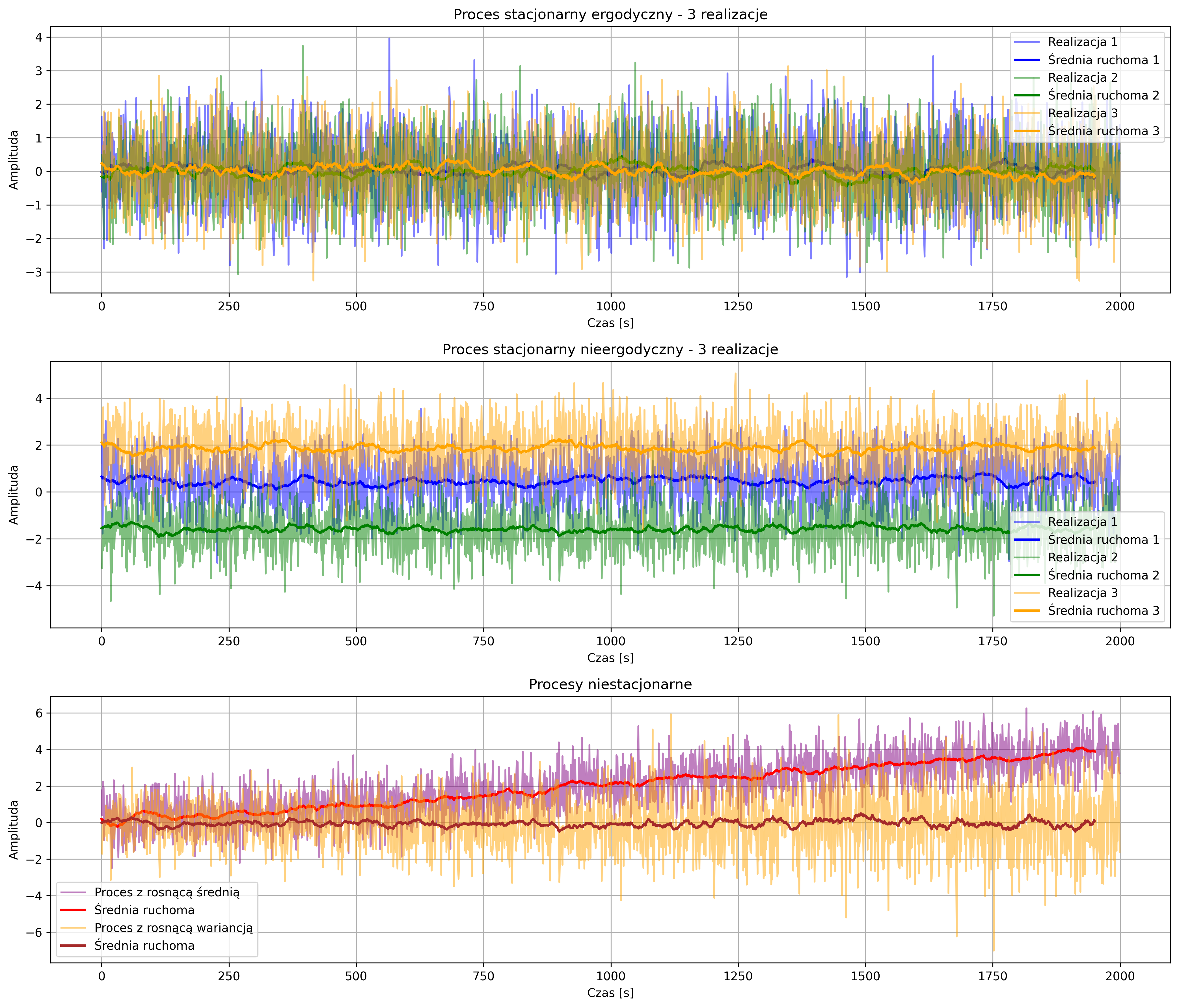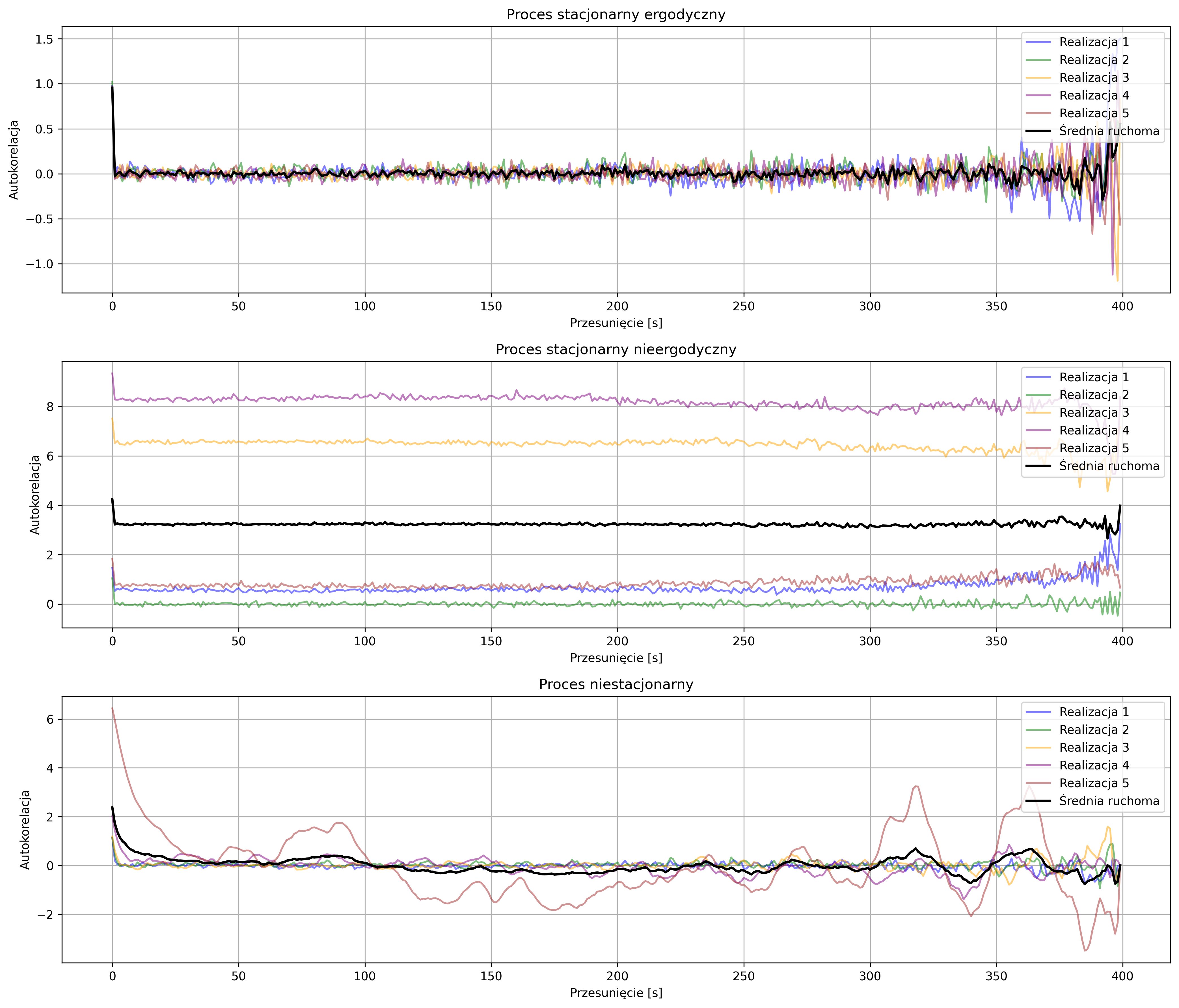 Na pierwszym wykresie rys. 5.4 pokazano trzy niezależne realizacje procesu o stałej średniej i wariancji. Średnie ruchome – wygładzenie sygnału w celu obserwacji lokalnych zmian średniej w czasie (grubsze linie w tych samych kolorach co realizacje) – oscylują wokół tej samej wartości, pokazując, że statystyki jednej realizacji dobrze odzwierciedlają statystyki całego procesu. W przypadku drugiego wykresu, średnie ruchome realizacji pokazują różne poziomy – widać, że statystyki jednej realizacji nie odzwierciedlają statystyk całego procesu, czyli proces nie jest ergodyczny, ale ze względu na stałą wariancję i średnią (każda realizacja procesu z inną, ale stałą średnią) proces jest stacjonarny. Ostatni wykres ilustruje procesy niestacjonarne – ze względu na rosnącą średnią i ze względu na rosnącą wariancję. Średnia ruchoma dla jednego procesu pokazuje wyraźny trend, zaś w przypadku drugiego procesu – pomimo stałości średniej – obserwujemy wzrost zmienności sygnału, co obrazuje brak stacjonarności.