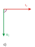 co oznacza, że napięcie na cewce wyprzedza prąd o kąt \(90^\circ\). Podobnie napięcie na kondensatorze opóźnia się względem swojego prądu o kąt \(90^\circ\), gdyż