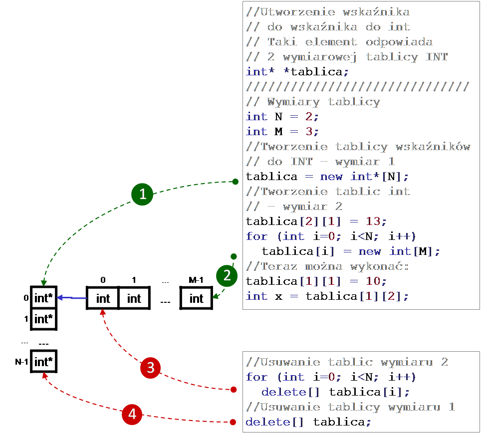 Dokładniejszy opis działań w przypadku dynamicznego tworzenia i kasowania tablicy zamieściliśmy na poniższym rysunku:
