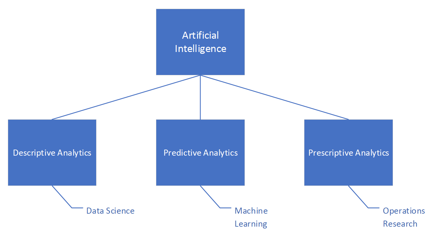 Ogólnie rozumianą sztuczną inteligencję można podzielić na trzy obszary. Pierwszy obszar dotyczy analityki deskryptywnej, gdzie dominują rolę odgrywa Data Science. Obszar drugi, analityka predykcyjna, to domena uczenia maszynowego. Zaś badania operacyjne dominują w obszarze analityki preskryptywnej, inaczej „nakazowej”. W tym obszarze wyznacza się sugestie (nakaz, zalecenie) jakie kroki i decyzje należy podjąć, aby uzyskać postawione cele. Należy zauważyć, że podział nie jest ostry i niektóre sytuacje mogą prowadzić do rozwiązań pośrednich.