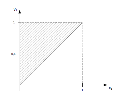 Zobaczmy przestrzeń rozwiązań dopuszczalnych np. dla \(x_{1,1}=1\), \(x_{2,1}=0\) to \(v_1 \in \langle 0,5;1 \rangle\):