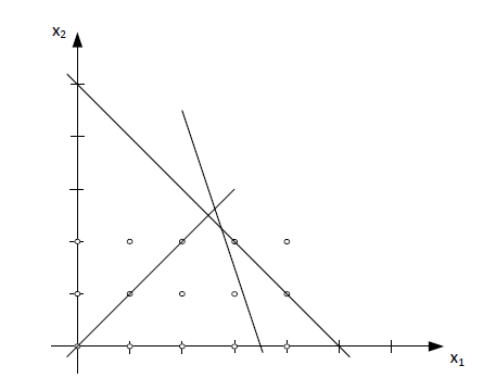 Zbiór rozwiązań dopuszczalnych jest następujący \( X=\{(0,0), (1,0), (2,0), (3,0), (1,1), (2,1), (3,1), (2,2)\} \) i na rysunku wygląda w następujący sposób: