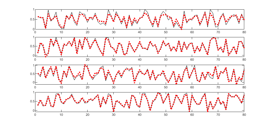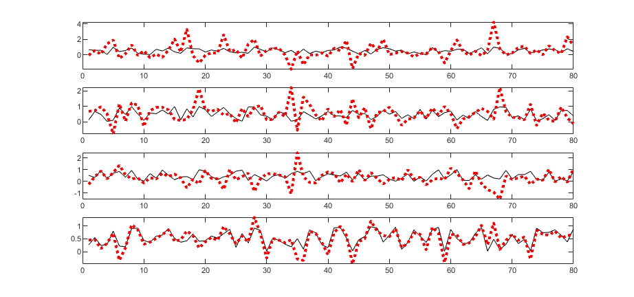 Rys. 4.6 Wynik działania regresyjnego sieci RBF w modelu sztucznego nosa elektronicznego: linia kropkowana czerwona – wartości zadane, linia ciągła czarna – wartości generowane przez model. W przypadku niedouczenia (rysunek a) i przeuczenia (rysunek c) model estymuje stężenia poszczególnych czterech składników gazowych z dużym błędem. Przy właściwym wyborze liczby neuronów ukrytych (rysunek b) wynik predykcji sieci zgadza się z dużą dokładnością z wartościami zadanymi.