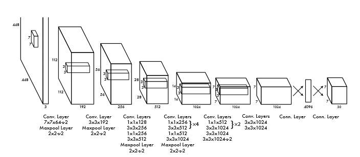 Struktura pierwotnie zaproponowanej sieci YOLO [52] przedstawiona jest na rys. 6.19. Zawiera 24 warstwy konwolucyjne lokalnie połączone do generacji cech diagnostycznych i dwie w pełni połączone warstwy odpowiedzialne jednocześnie za zadanie klasyfikacji (rozpoznanie klasy obiektów) oraz zadanie regresji (określenie współrzędnych wystąpienia poszczególnych obiektów). Zastosowany wymiar komórki \(S=7\). Wyjściowa warstwa sieci generuje jednocześnie prawdopodobieństwo przynależności określonej komórki do klasy obiektu (klasyfikacja) oraz współrzędne obwiedni poszczególnych obiektów (regresja). Sieć używa funkcje aktywacji typu Leaky ReLU. Uczenie sprowadza się do odpowiednio zdefiniowanej funkcji celu w postaci błędu średniokwadratowego. Funkcja taka jest złożeniem składników odpowiedzialnych za klasyfikację oraz składników odpowiedzialnych za regresję. W jego procesie przyjmuje się, że każda obwiednia (bounding box) skojarzona jest jedynie z jednym obiektem na podstawie największej wartości IOU.