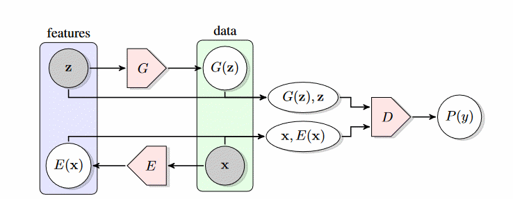 Struktura sieci BIGAN zawiera enkoder \( E \) który transformuje dane oryginalne \( \mathbf{X} \) do przestrzeni wektorowej \( E(\mathbf{X}) \), generując wektor cech o wymiarach identycznych z wektorem losowym \( \mathbf{z} \). Dyskryminator \( D \) sieci BIGAN dokonuje więc rozróżnienia pary danych \( (\mathbf{X}, E(\mathbf{X})) \) oraz \( (G(\mathbf{z}), \mathbf{z}) \) zamiast (\( \mathbf{X} \) versus \( G(\mathbf{z}) \)) w klasycznej implementacji GAN. Jest oczywiste, że enkoder \( E \) próbuje „nauczyć” się inwersji generatora \( G \) (czyli wektora \( \mathbf{z} \)), choć nie występuje tu bezpośrednia komunikacja. Zwiększona informacja (w stosunku do wersji oryginalnej GAN) dostarczona do dyskryminatora umożliwia polepszenie dokładności rozpoznania „podróbki” od oryginału.