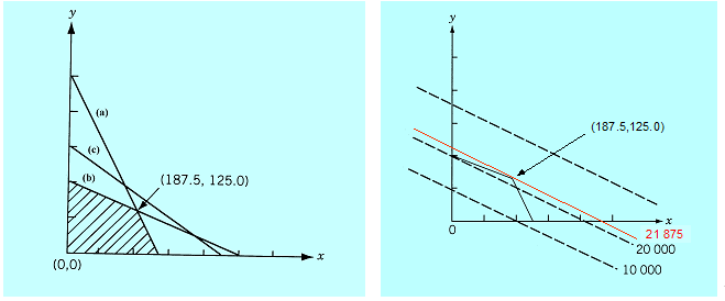 Z rysunku wynika, że ograniczenie (c) nie jest potrzebne, oraz że zbiór dopuszczalny jest wielokątem Linie poziomicowe funkcji liniowej to proste, zatem rozwiązanie leży w wierzchołku wielokąta (albo rozwiązań jest wiele i leżą na brzegu wielokąta, gdy poziomice są równoległe do stosownego ograniczenia).