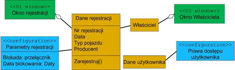 oznaczone odpowiednio stereotypami <<UI window>> i <<configuration>>.