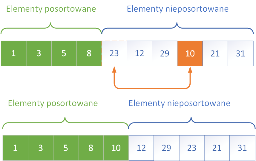 - sortowanie przez wybieranie (ang. SelectionSort),
