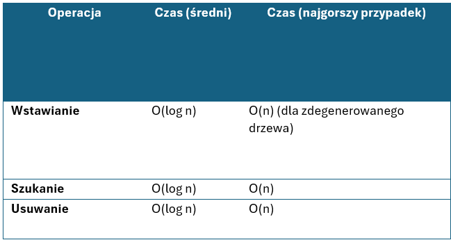W tabeli poniżej przedstawiono złożoność obliczeniową poszczególnych operacji wykonywanych w drzewie BST.- wszystkie wartości w lewym poddrzewie są mniejsze niż wartość w tym węźle,