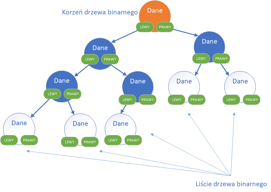 Bardzo ważną oraz często wykorzystywaną strukturą danych jest drzewo binarne. Jest to struktura hierarchiczna, w której każdy węzeł może mieć co najwyżej dwóch potomków. Zazwyczaj określa się ich jako lewy i prawy syn. Węzeł, który nie posiada żadnego potomka, nazywany jest liściem drzewa, natomiast węzeł bez poprzednika to korzeń drzewa.
